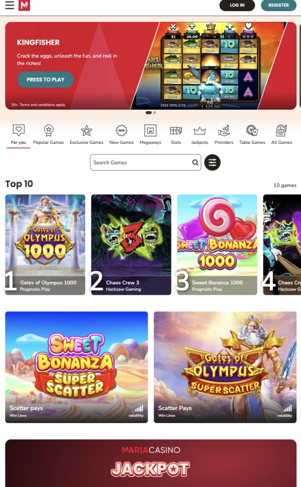NĂ„r du Ă„pner Maria Casino pĂ„ telefonen din, fĂ„r du full tilgang til kampanjer, kasseverktĂžy og hele spillobbyen. Biblioteket vĂ„rt inkluderer 2424 spill, med kjente leverandĂžrer som Games Global, NetEnt, Evolution Gaming, Playân GO, Pragmatic Play, Red Tiger, Blueprint Gaming, Quickspin, Relax Gaming og IGT. For rettferdighet og Ă„penhet er vĂ„r gjennomsnittlige tilbakebetalingsprosent 96.01% basert pĂ„ eCOGRA-revisjoner.